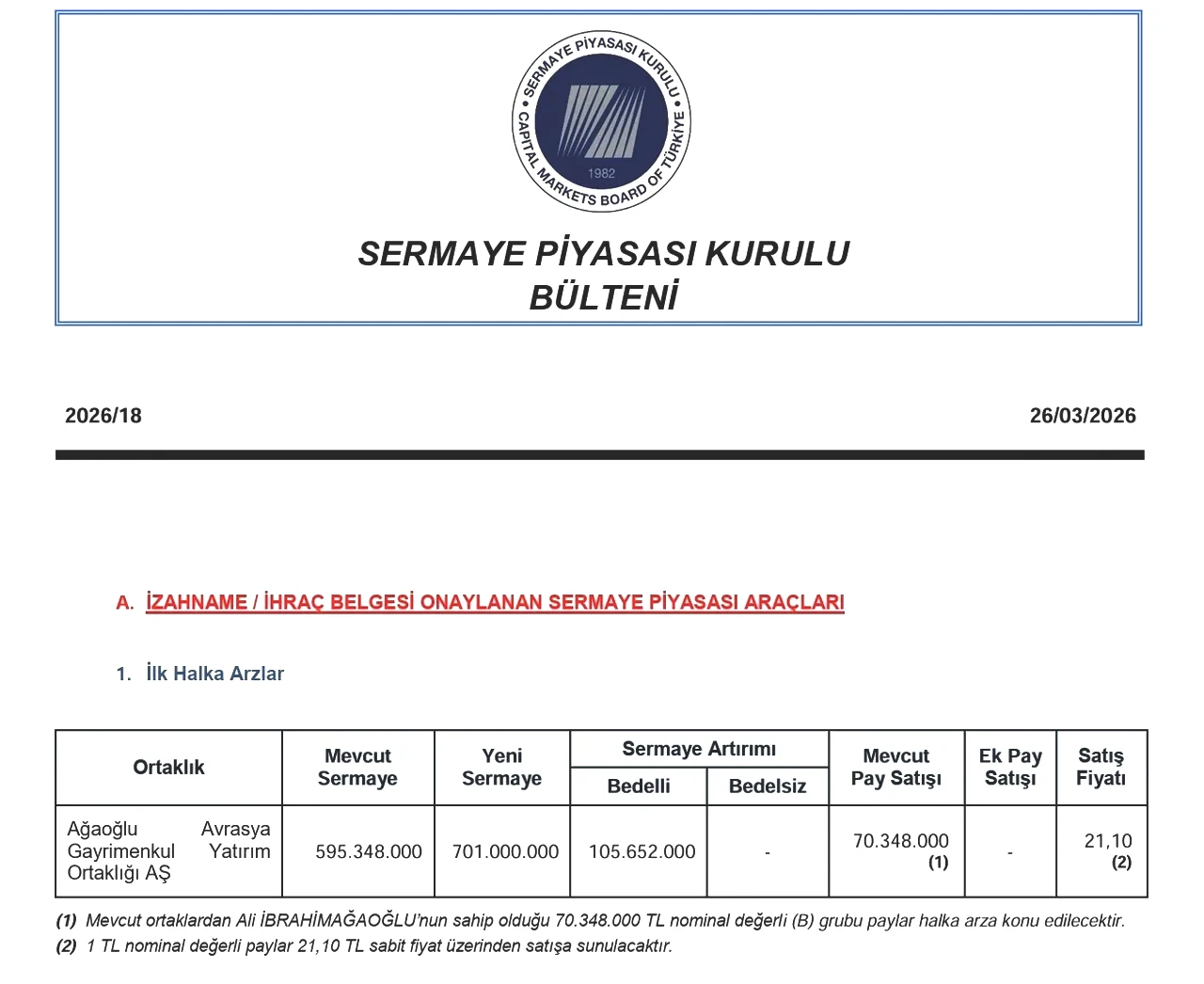 Ağaoğlu Avrasya GYO’nun halka arzında talep toplama tarihleri 1-2-3 Nisan 2026 tarihleri arasında gerçekleştirilecek. Üç gün sürecek bu talep toplama sürecinde yatırımcılar belirlenen fiyattan hisse almak için başvuru yapabilecekler. Halka arzın toplam büyüklüğü ise 3,7 milyar TL olarak kaydedildi.