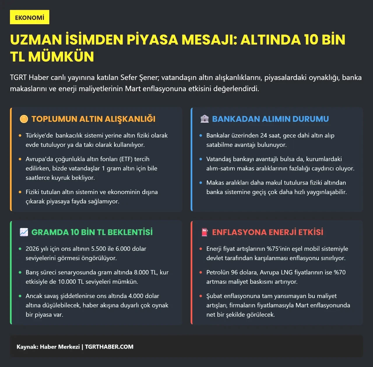 Altın fiyatlarına ilişkin yıl sonu tahminlerini de aktaran Şener, "Şu anda ons altın 4.500 dolar seviyesinde. 2026 için tahminler 5.500–6.000 dolar aralığındaydı. Gram altın içinse 8.000–10.000 TL gibi bir beklenti vardı, ancak savaş bu durumu değiştirdi. Faiz indirimlerinin engellenmesi sebebiyle altın fiyatları geriledi. Yıl sonu için öngörülerimizde köklü bir değişiklik söz konusu değil. Eğer kısa vadede barış mesajları güçlenirse, 2026'da 5.500 dolar ve hatta 6.000 dolara kadar çıkılabileceği düşünülüyor. Gram altının 8.000 TL'yi aşması, kur etkisiyle 10.000 TL'ye ulaşması mümkün olabilir" ifadelerinde bulundu.